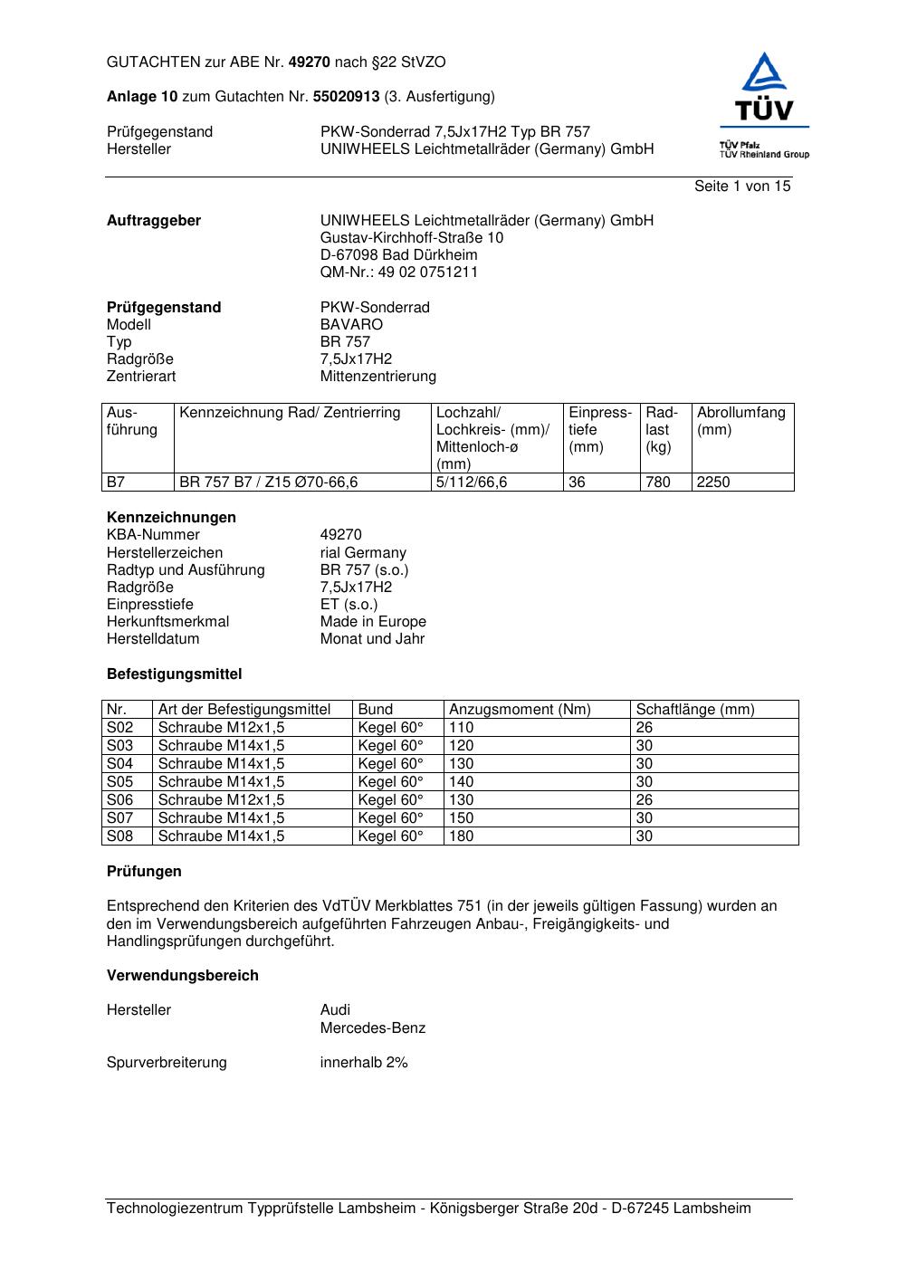 Dieses Gutachten (abe) bezieht sich auf die Alufelge brand-rial BR 757 in der Ausführung 7.5Jx17 ET 0, Mittenloch 0 mm (KBA 49270). Im PDF findest du typischerweise zulässige Reifengrößen, Auflagen/Anbauhinweise und – je nach Dokument – Hinweise zur Eintragung.