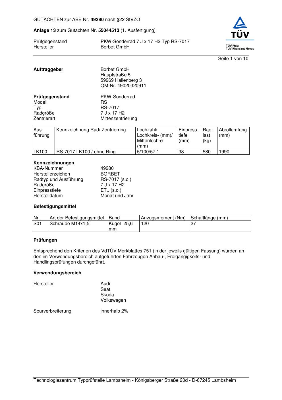 Dieses Gutachten (abe) bezieht sich auf die Alufelge Borbet RS-701 7 in der Ausführung 7Jx17 ET 0, Mittenloch 0 mm (KBA 49280). Im PDF findest du typischerweise zulässige Reifengrößen, Auflagen/Anbauhinweise und – je nach Dokument – Hinweise zur Eintragung.