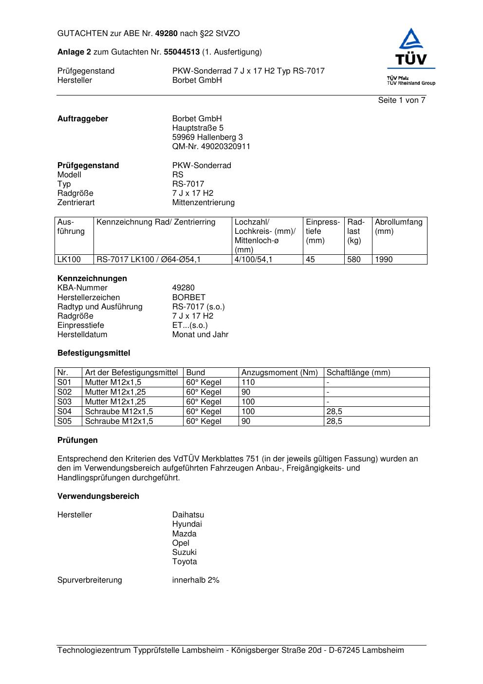 Dieses Gutachten (abe) bezieht sich auf die Alufelge Borbet RS-701 7 in der Ausführung 7Jx17 ET 0, Mittenloch 0 mm (KBA 49280). Im PDF findest du typischerweise zulässige Reifengrößen, Auflagen/Anbauhinweise und – je nach Dokument – Hinweise zur Eintragung.
