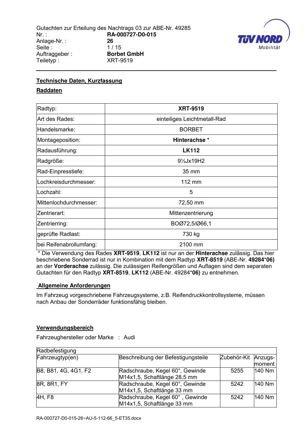 Dieses Gutachten (abe) bezieht sich auf die Alufelge brand-borbet XRT-9519 in der Ausführung 8.5Jx19 ET 0, Mittenloch 0 mm (KBA 49284). Im PDF findest du typischerweise zulässige Reifengrößen, Auflagen/Anbauhinweise und – je nach Dokument – Hinweise zur Eintragung.