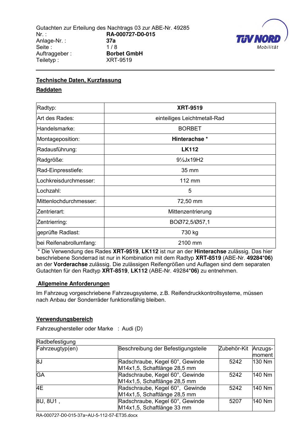 Dieses Gutachten (abe) bezieht sich auf die Alufelge brand-borbet XRT-9519 in der Ausführung 8.5Jx19 ET 0, Mittenloch 0 mm (KBA 49284). Im PDF findest du typischerweise zulässige Reifengrößen, Auflagen/Anbauhinweise und – je nach Dokument – Hinweise zur Eintragung.