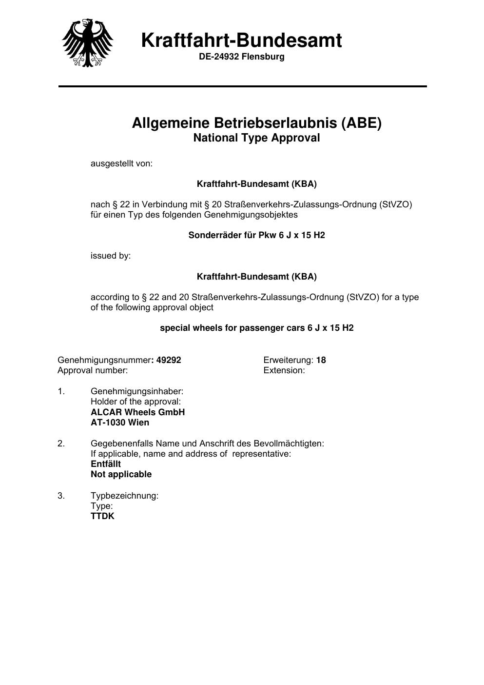 Felgengutachten / abe für Alufelgen ATS PSN 9521 (6Jx15 ET 0, Mittenloch 0 mm) mit KBA 49292 (Zertifikatsnummer 49292). Hier kostenlos als PDF herunterladen. Der Download-Link ist 24 Stunden gültig und kann bis zu zwei Mal verwendet werden.