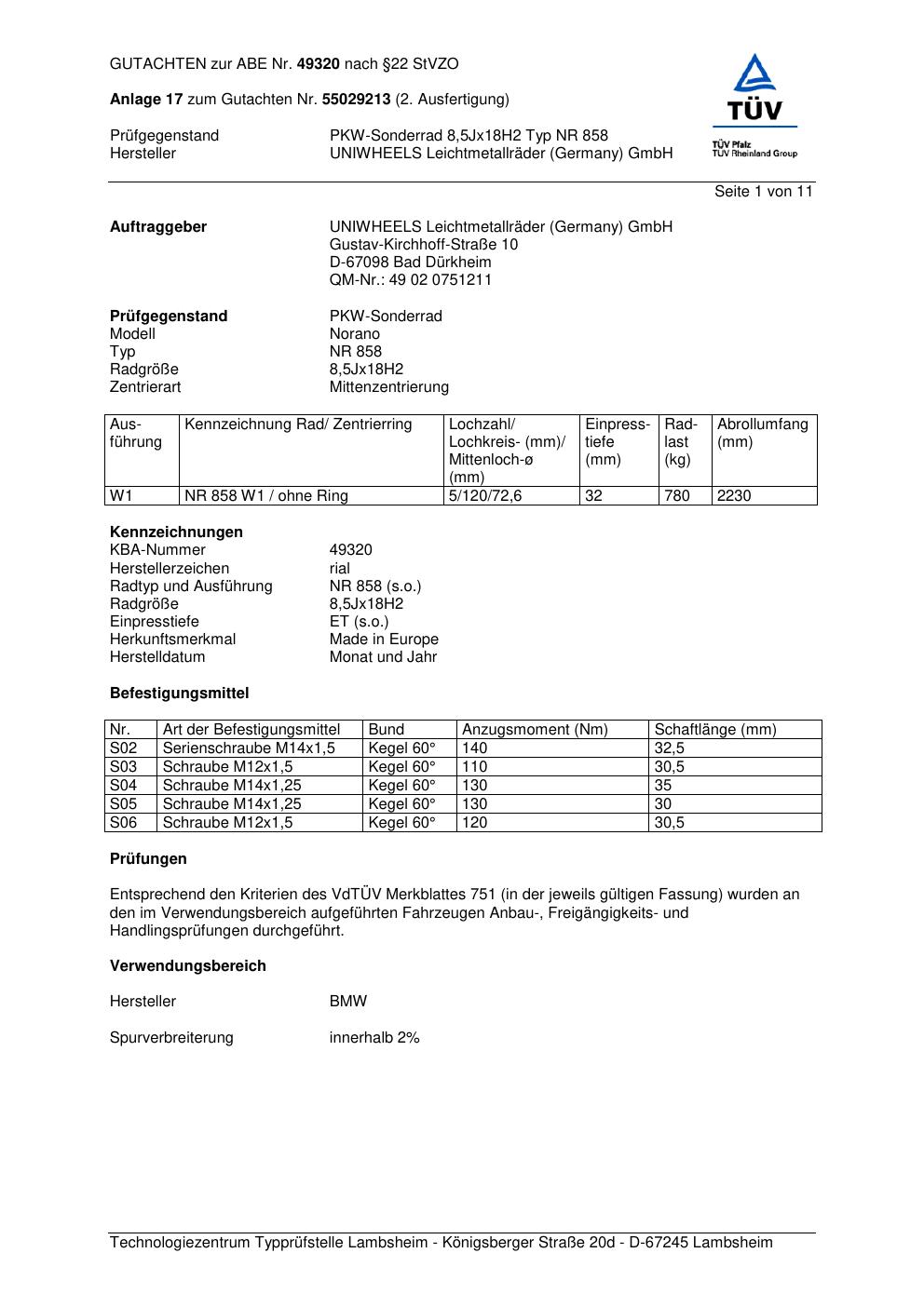 Dieses Gutachten (abe) bezieht sich auf die Alufelge brand-rial NR 858 in der Ausführung 8.5Jx18 ET 0, Mittenloch 0 mm (KBA 49320). Im PDF findest du typischerweise zulässige Reifengrößen, Auflagen/Anbauhinweise und – je nach Dokument – Hinweise zur Eintragung.
