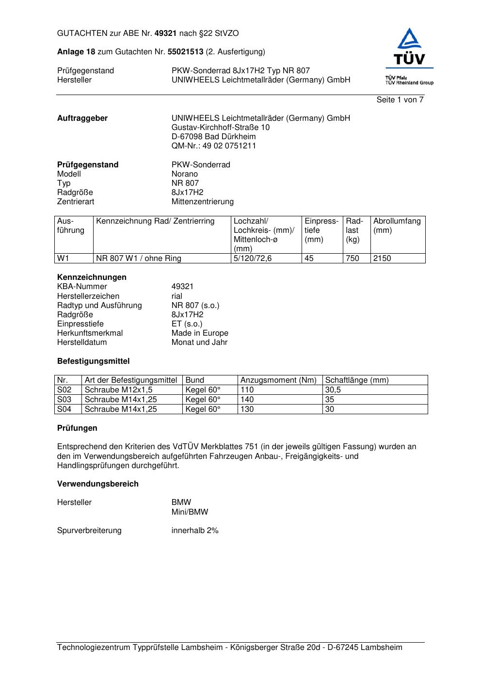 Dieses Gutachten (abe) bezieht sich auf die Alufelge brand-rial NR 807 in der Ausführung 8Jx17 ET 0, Mittenloch 0 mm (KBA 49321). Im PDF findest du typischerweise zulässige Reifengrößen, Auflagen/Anbauhinweise und – je nach Dokument – Hinweise zur Eintragung.