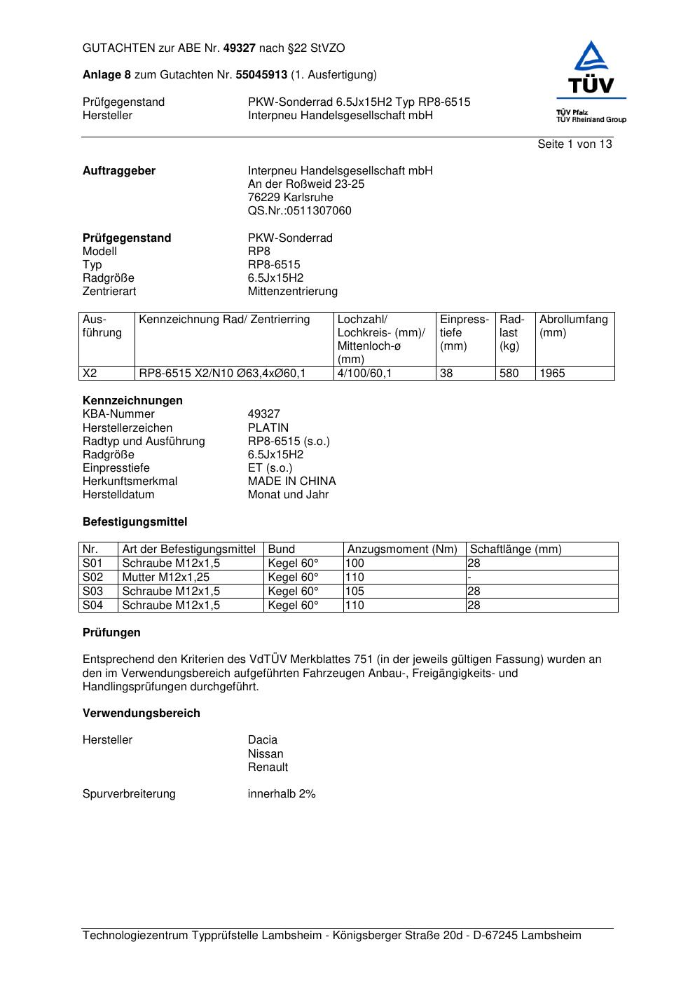 Dieses Gutachten (abe) bezieht sich auf die Alufelge Platin RP8-6515 in der Ausführung 6.5Jx15 ET 0, Mittenloch 0 mm (KBA 49327). Im PDF findest du typischerweise zulässige Reifengrößen, Auflagen/Anbauhinweise und – je nach Dokument – Hinweise zur Eintragung.