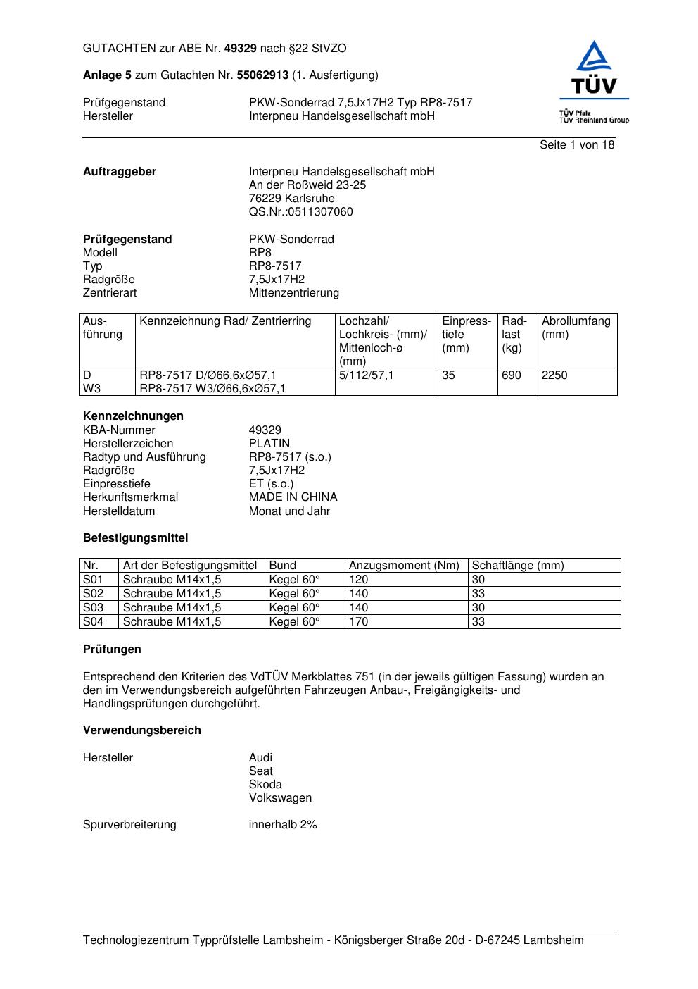 Felgengutachten / abe für Alufelgen Platin RP8-7517 (7.5Jx17 ET 0, Mittenloch 0 mm) mit KBA 49329 (Zertifikatsnummer 49329). Hier kostenlos als PDF herunterladen. Der Download-Link ist 24 Stunden gültig und kann bis zu zwei Mal verwendet werden.