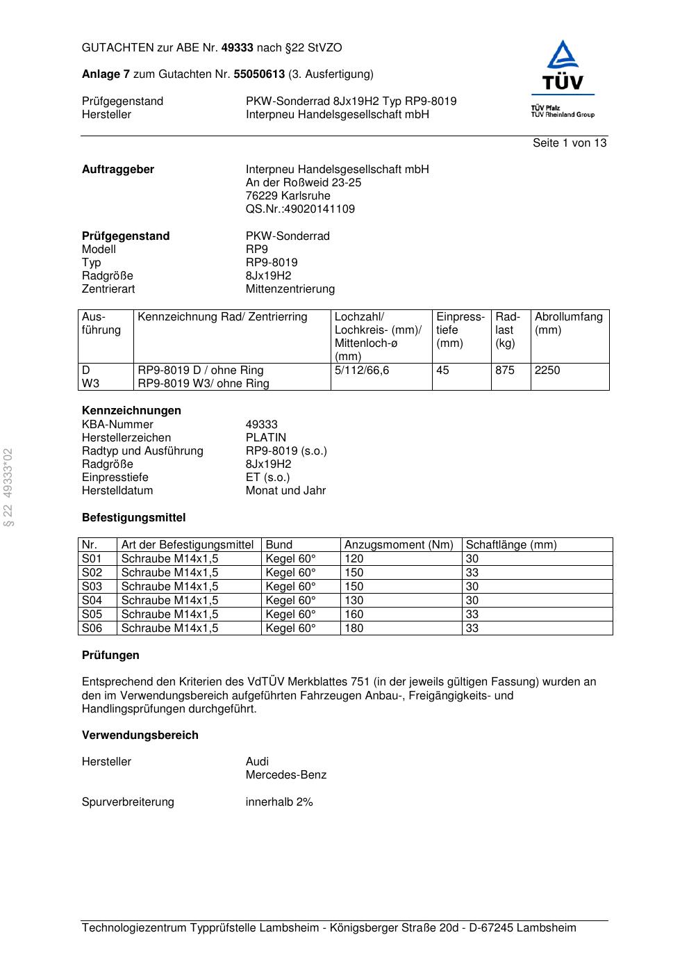 • Stimmt die KBA-Nummer auf der Felge mit diesem Dokument überein?