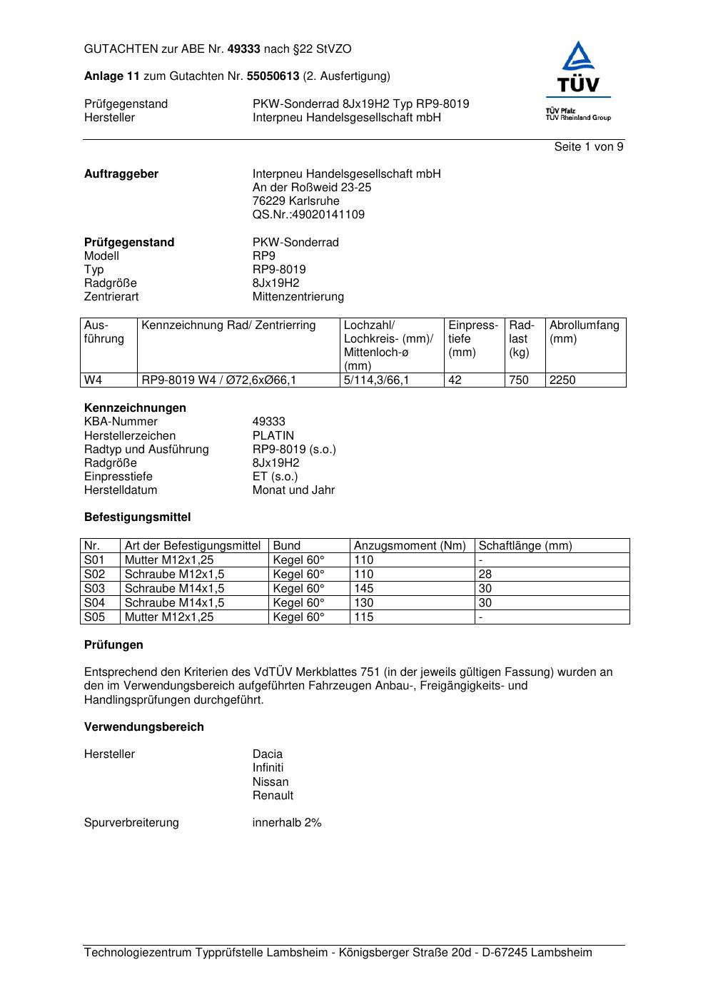Dieses abe gehört zur Felge Platin RP9-8019 in 8Jx19 ET0 mit KBA 49333. Die Seite ist dafür gedacht, dass du schnell prüfen kannst, ob KBA, Design und Größe zu deiner Felge passen und danach direkt das richtige PDF lädst.