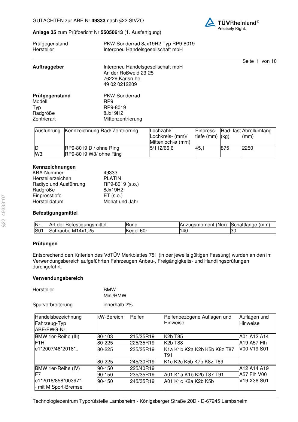 • Stimmt die KBA-Nummer auf der Felge mit diesem Dokument überein?