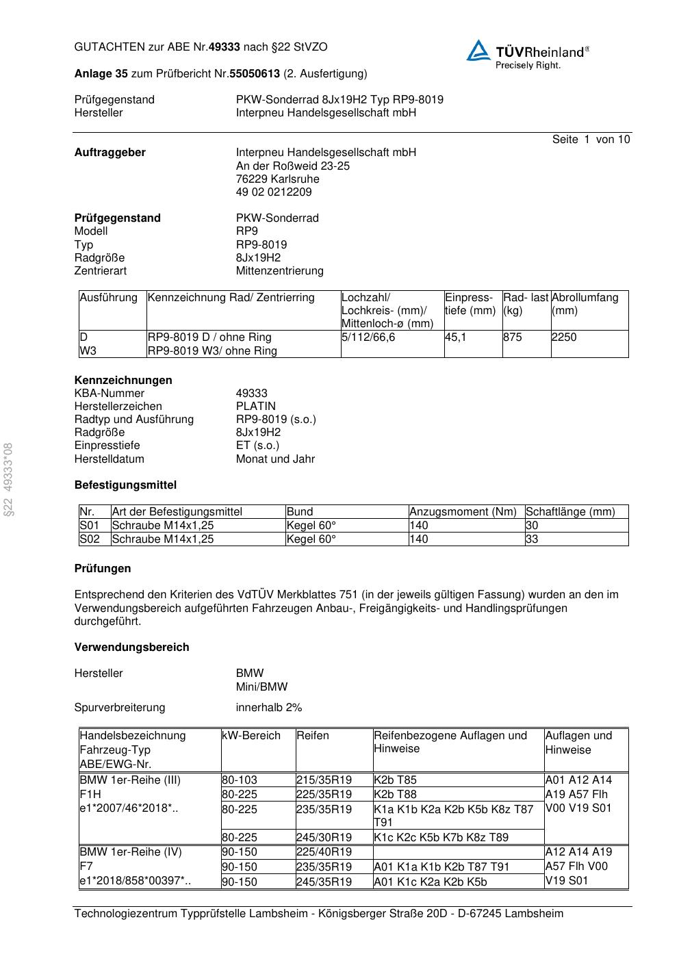 • Stimmt die KBA-Nummer auf der Felge mit diesem Dokument überein?