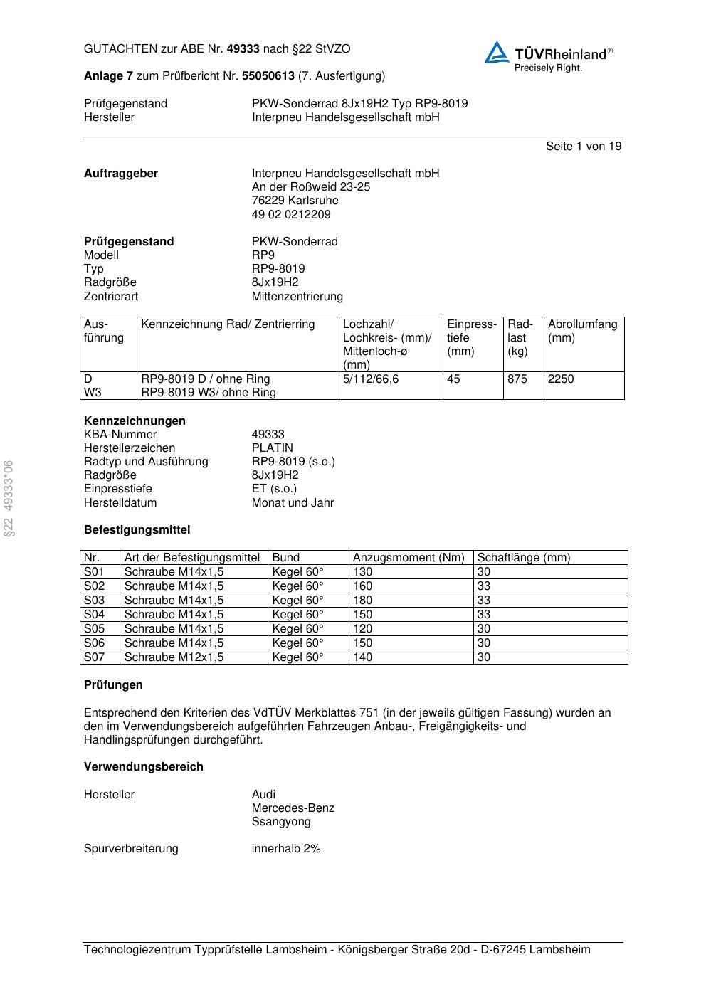 • Stimmt die KBA-Nummer auf der Felge mit diesem Dokument überein?