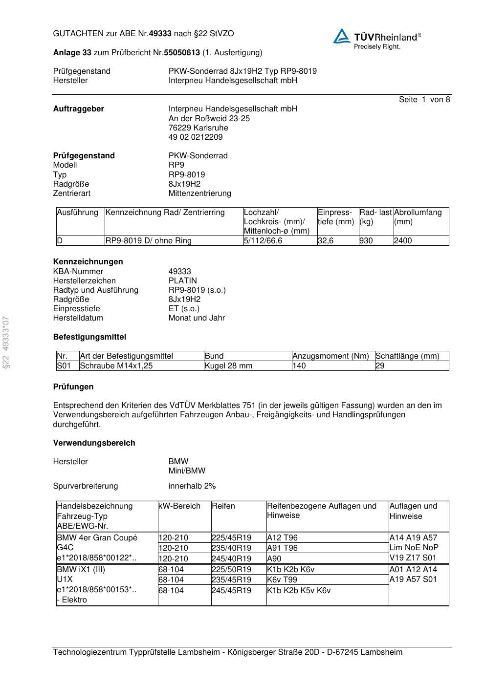 Dieses abe gehört zur Felge Platin RP9-8019 in 8Jx19 ET0 mit KBA 49333. Die Seite ist dafür gedacht, dass du schnell prüfen kannst, ob KBA, Design und Größe zu deiner Felge passen und danach direkt das richtige PDF lädst.