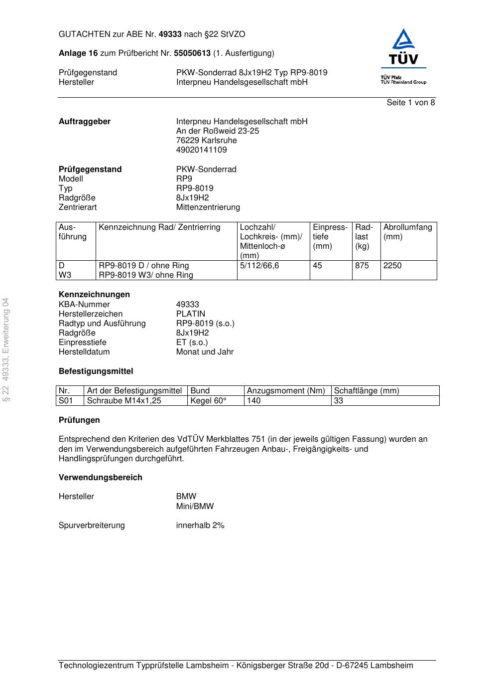 8.0Jx19 ET0.0 · KBA 49333