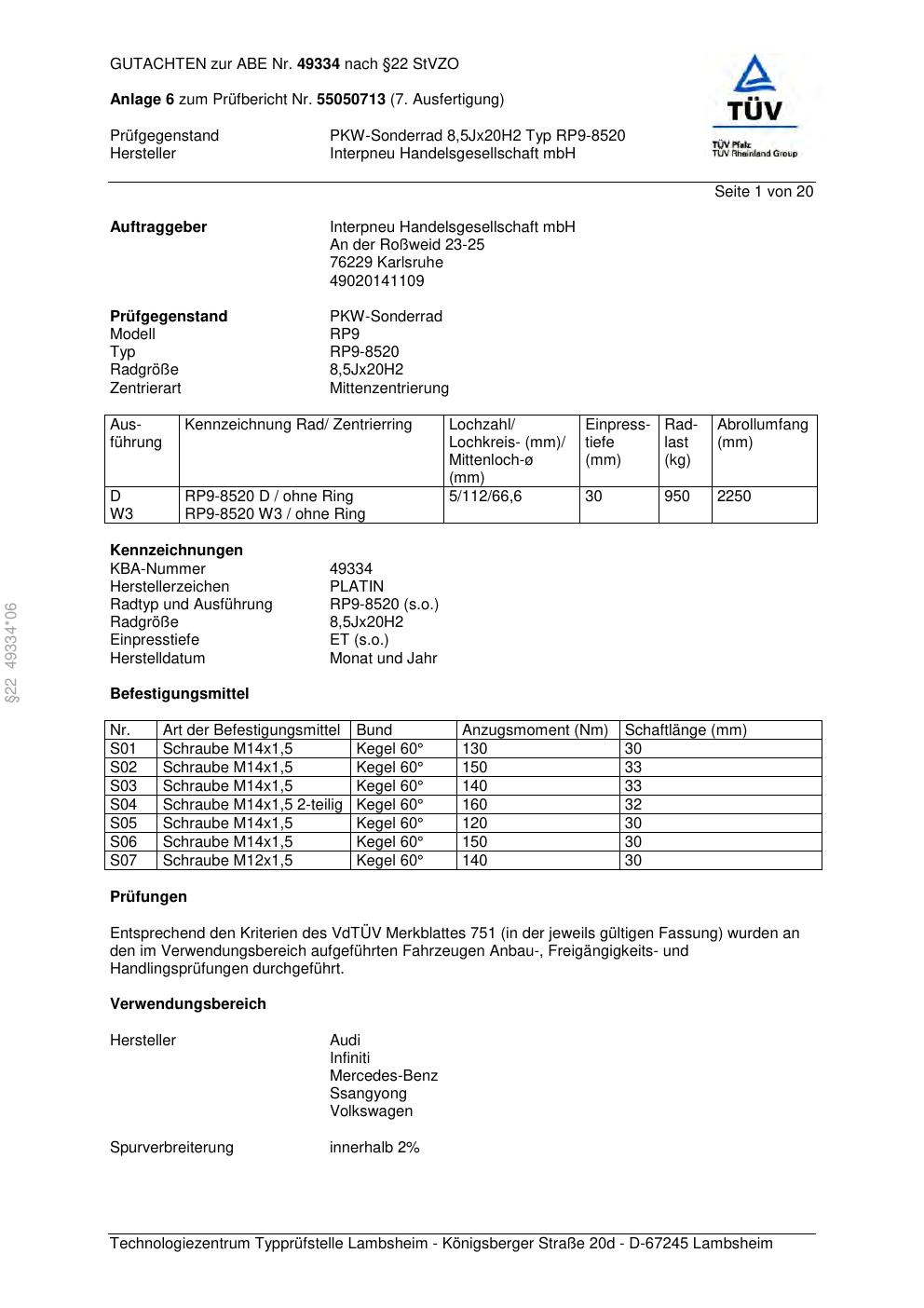 • Stimmt die KBA-Nummer auf der Felge mit diesem Dokument überein?