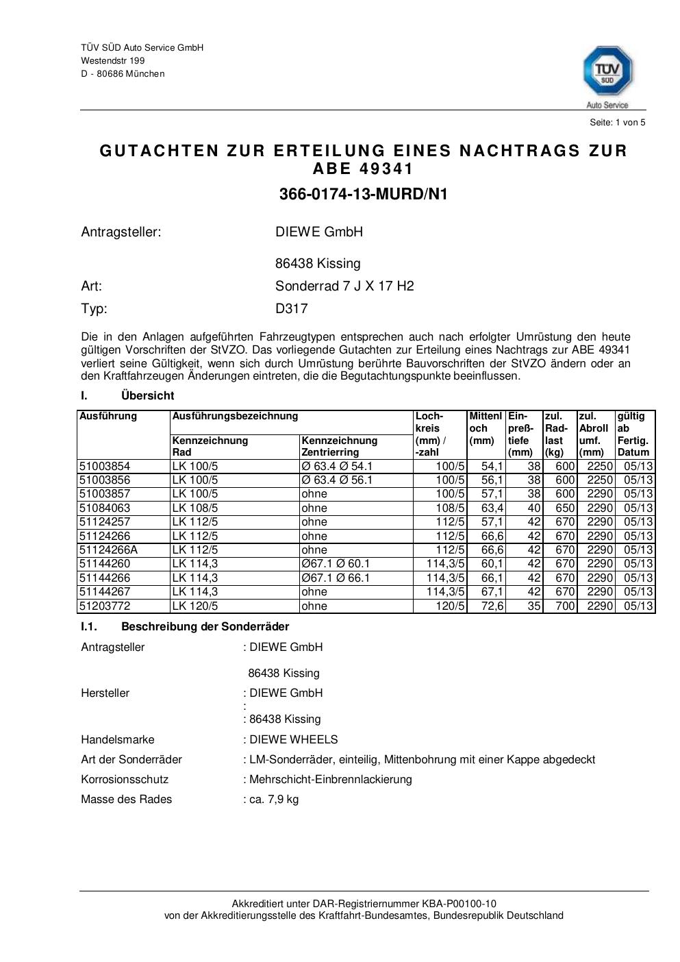 Dieses Gutachten (abe) bezieht sich auf die Alufelge Diewe D317 in der Ausführung 7Jx17 ET 0, Mittenloch 0 mm (KBA 49341). Im PDF findest du typischerweise zulässige Reifengrößen, Auflagen/Anbauhinweise und – je nach Dokument – Hinweise zur Eintragung.