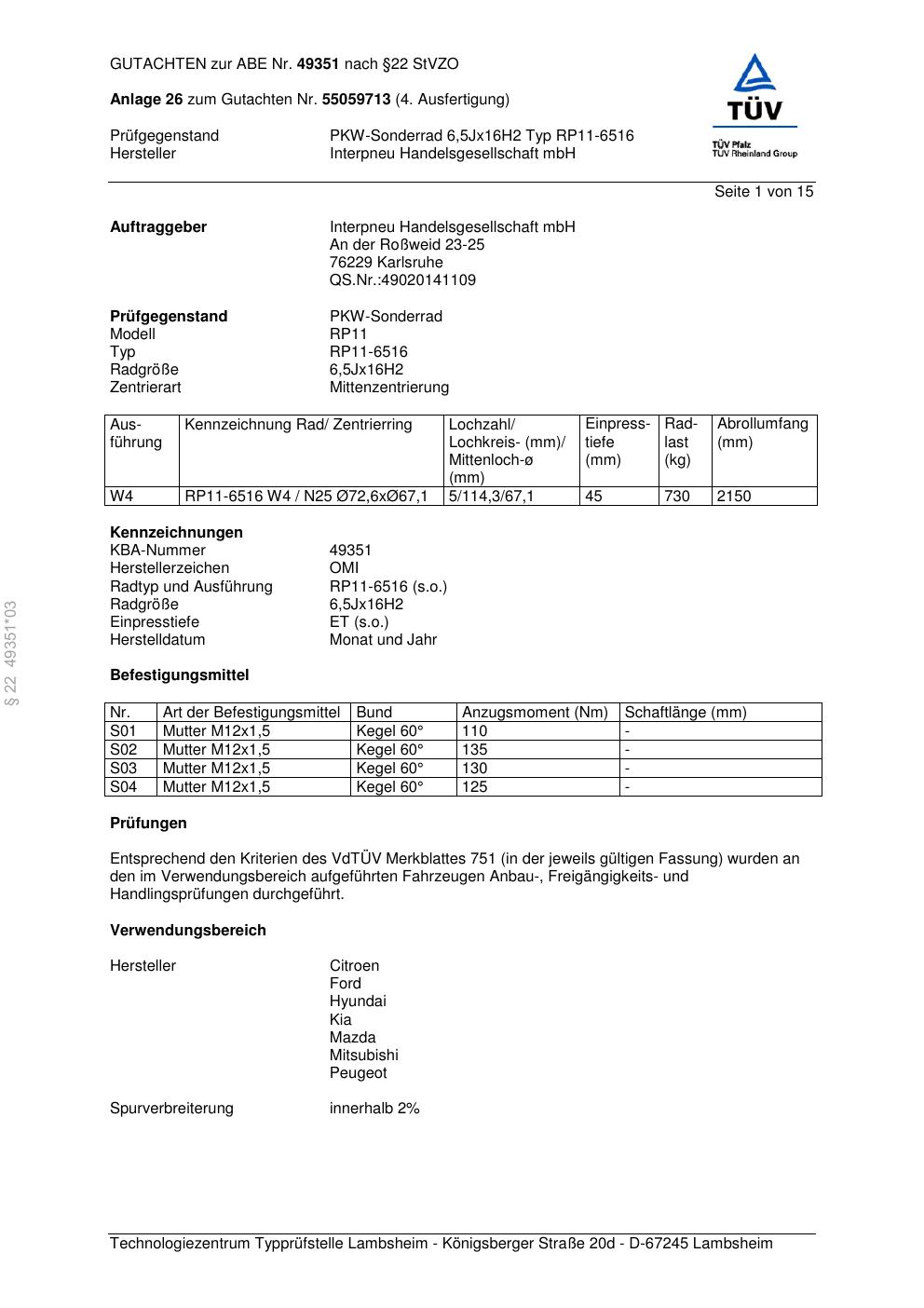 Dieses Gutachten (abe) bezieht sich auf die Alufelge Platin RP11-651 6 in der Ausführung 6.5Jx16 ET 0, Mittenloch 0 mm (KBA 49351). Im PDF findest du typischerweise zulässige Reifengrößen, Auflagen/Anbauhinweise und – je nach Dokument – Hinweise zur Eintragung.