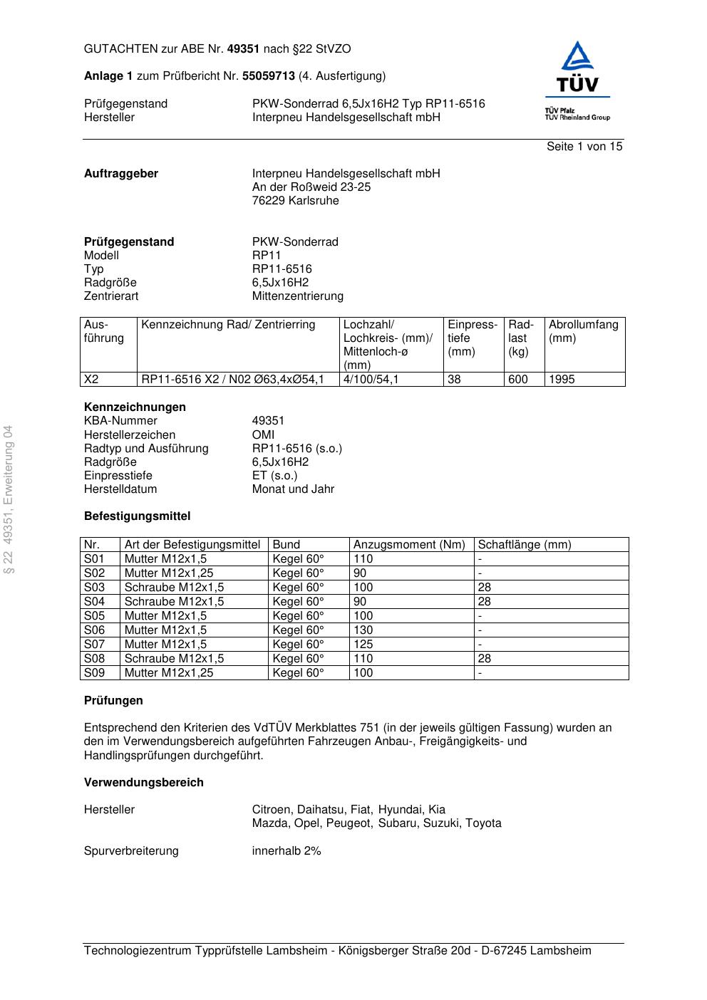 Dieses Gutachten (abe) bezieht sich auf die Alufelge Platin RP11-651 6 in der Ausführung 6.5Jx16 ET 0, Mittenloch 0 mm (KBA 49351). Im PDF findest du typischerweise zulässige Reifengrößen, Auflagen/Anbauhinweise und – je nach Dokument – Hinweise zur Eintragung.