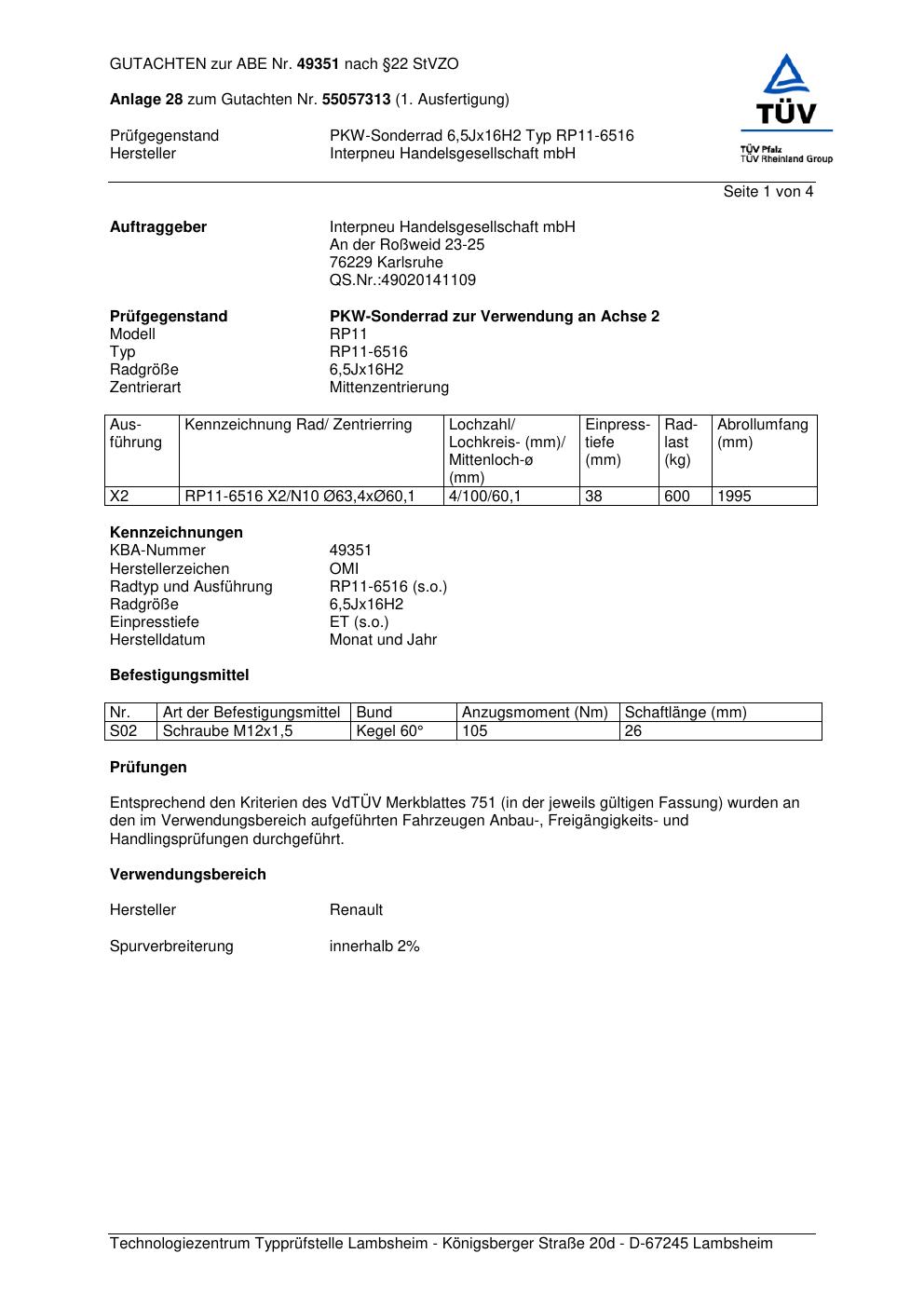 Dieses Gutachten (abe) bezieht sich auf die Alufelge Platin RP11-651 6 in der Ausführung 6.5Jx16 ET 0, Mittenloch 0 mm (KBA 49351). Im PDF findest du typischerweise zulässige Reifengrößen, Auflagen/Anbauhinweise und – je nach Dokument – Hinweise zur Eintragung.