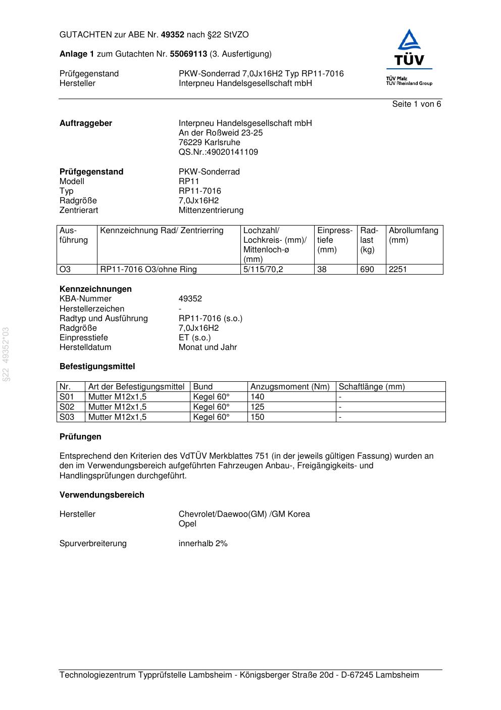 Dieses Gutachten (abe) bezieht sich auf die Alufelge Platin RP11-701 6 in der Ausführung 7Jx16 ET 0, Mittenloch 0 mm (KBA 49352). Im PDF findest du typischerweise zulässige Reifengrößen, Auflagen/Anbauhinweise und – je nach Dokument – Hinweise zur Eintragung.