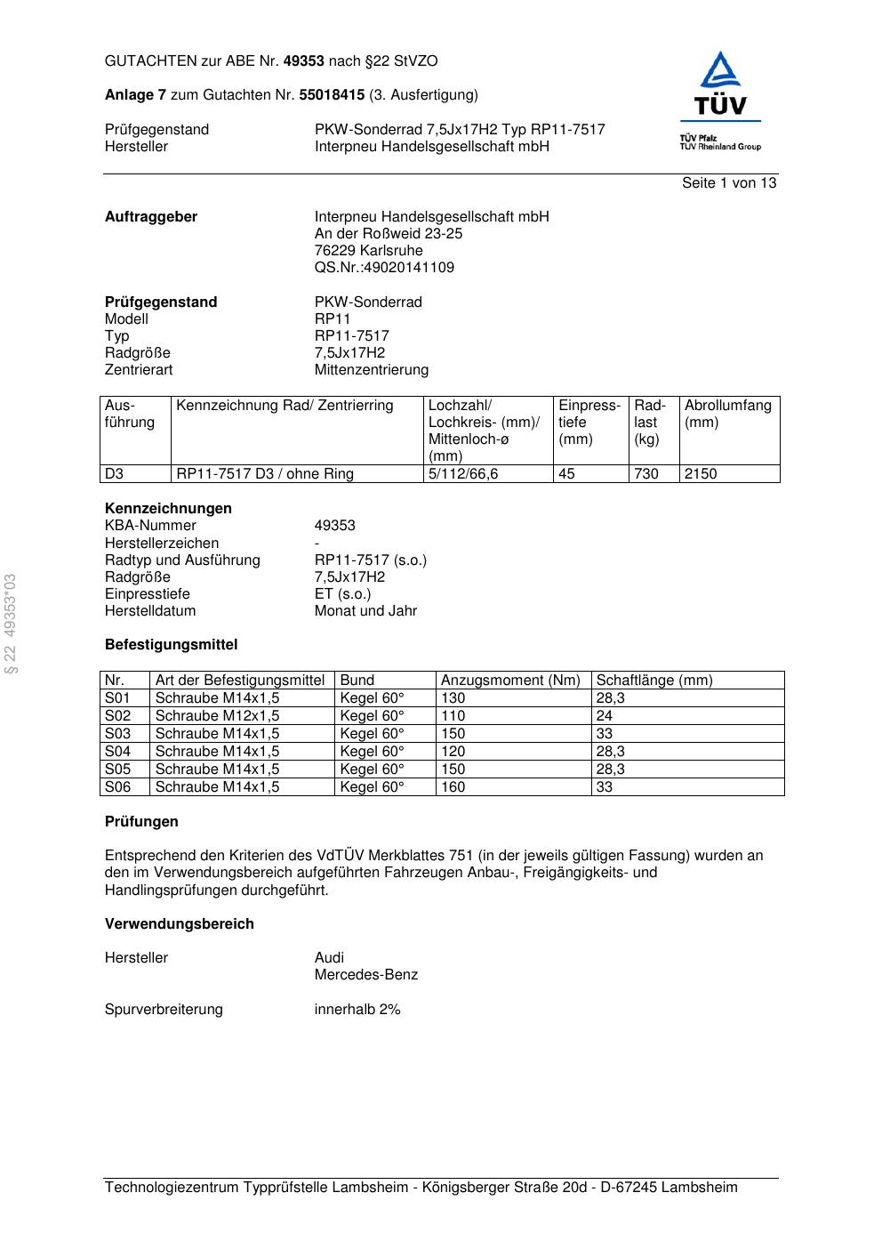 Dieses Gutachten (abe) bezieht sich auf die Alufelge Platin RP11-751 7 in der Ausführung 7.5Jx17 ET 0, Mittenloch 0 mm (KBA 49353). Im PDF findest du typischerweise zulässige Reifengrößen, Auflagen/Anbauhinweise und – je nach Dokument – Hinweise zur Eintragung.