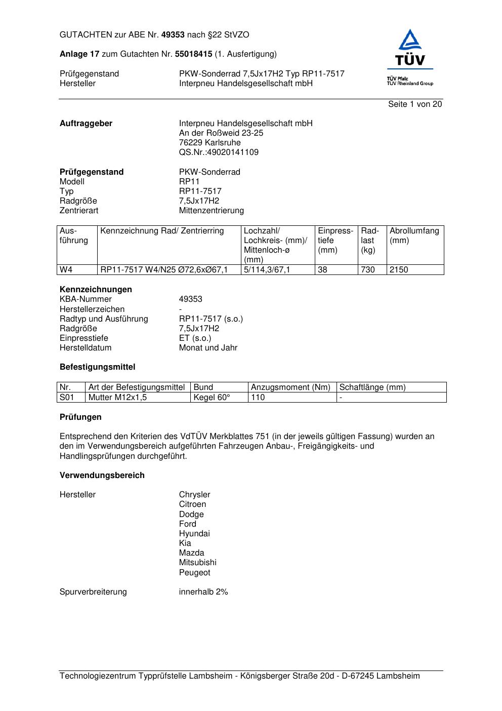 Dieses Gutachten (abe) bezieht sich auf die Alufelge Platin RP11-751 7 in der Ausführung 7.5Jx17 ET 0, Mittenloch 0 mm (KBA 49353). Im PDF findest du typischerweise zulässige Reifengrößen, Auflagen/Anbauhinweise und – je nach Dokument – Hinweise zur Eintragung.