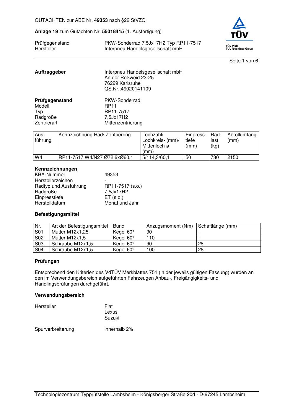 Dieses Gutachten (abe) bezieht sich auf die Alufelge Platin RP11-751 7 in der Ausführung 7.5Jx17 ET 0, Mittenloch 0 mm (KBA 49353). Im PDF findest du typischerweise zulässige Reifengrößen, Auflagen/Anbauhinweise und – je nach Dokument – Hinweise zur Eintragung.