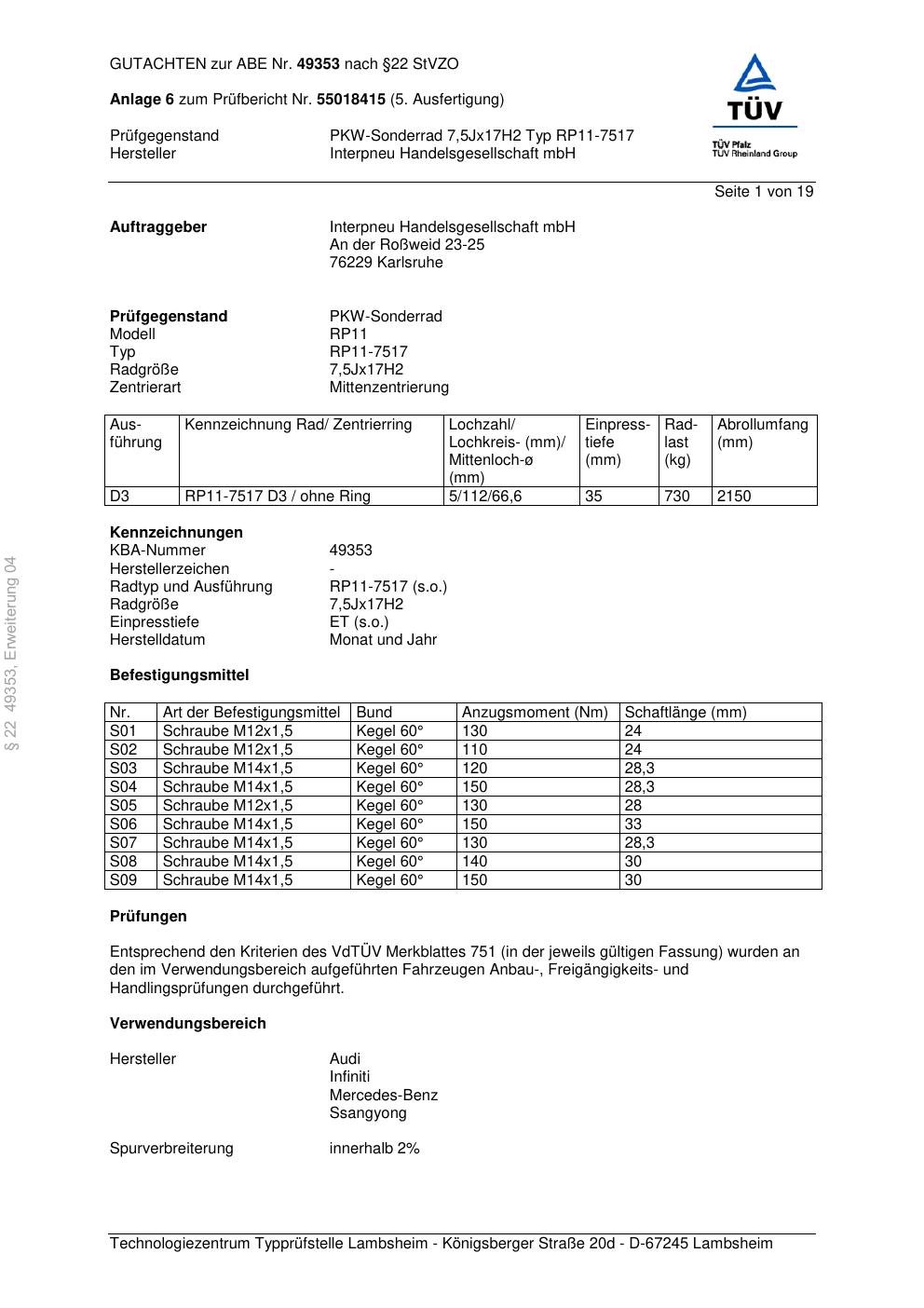 Felgengutachten / abe für Alufelgen Platin RP11-751 7 (7.5Jx17 ET 0, Mittenloch 0 mm) mit KBA 49353 (Zertifikatsnummer 49353). Hier kostenlos als PDF herunterladen. Der Download-Link ist 24 Stunden gültig und kann bis zu zwei Mal verwendet werden.