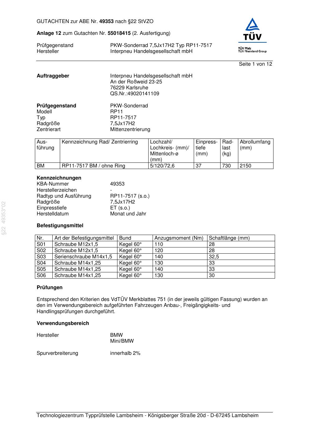 Dieses Gutachten (abe) bezieht sich auf die Alufelge Platin RP11-751 7 in der Ausführung 7.5Jx17 ET 0, Mittenloch 0 mm (KBA 49353). Im PDF findest du typischerweise zulässige Reifengrößen, Auflagen/Anbauhinweise und – je nach Dokument – Hinweise zur Eintragung.