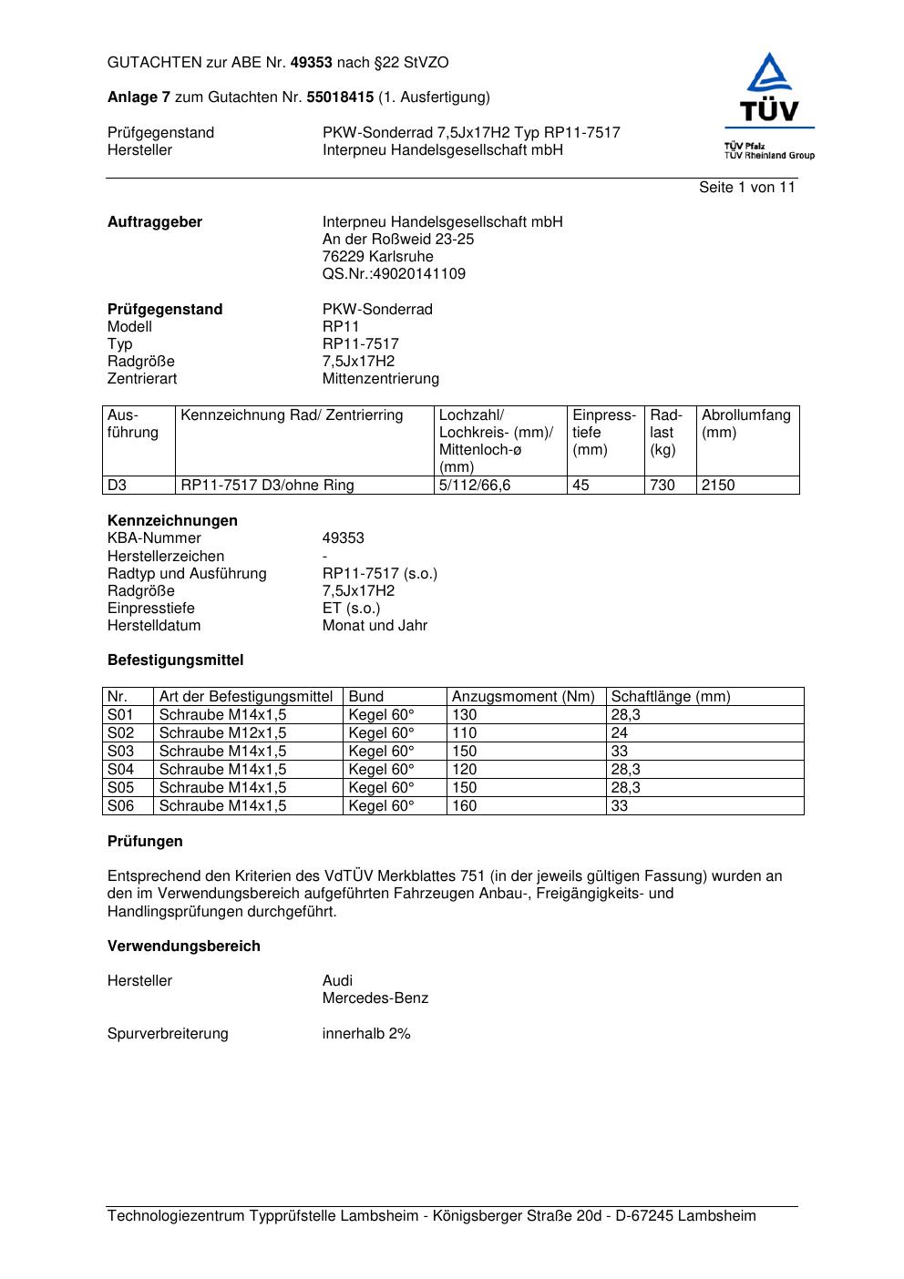 Dieses Gutachten (abe) bezieht sich auf die Alufelge Platin RP11-751 7 in der Ausführung 7.5Jx17 ET 0, Mittenloch 0 mm (KBA 49353). Im PDF findest du typischerweise zulässige Reifengrößen, Auflagen/Anbauhinweise und – je nach Dokument – Hinweise zur Eintragung.