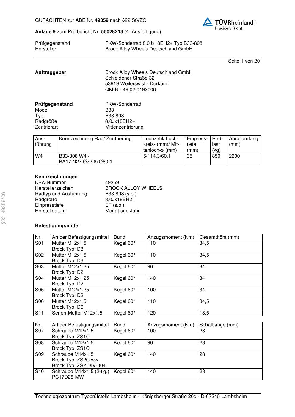 Dieses Gutachten (abe) bezieht sich auf die Alufelge Brock B33-80 8 in der Ausführung ET 0, Mittenloch 0 mm (KBA 49359). Im PDF findest du typischerweise zulässige Reifengrößen, Auflagen/Anbauhinweise und – je nach Dokument – Hinweise zur Eintragung.
