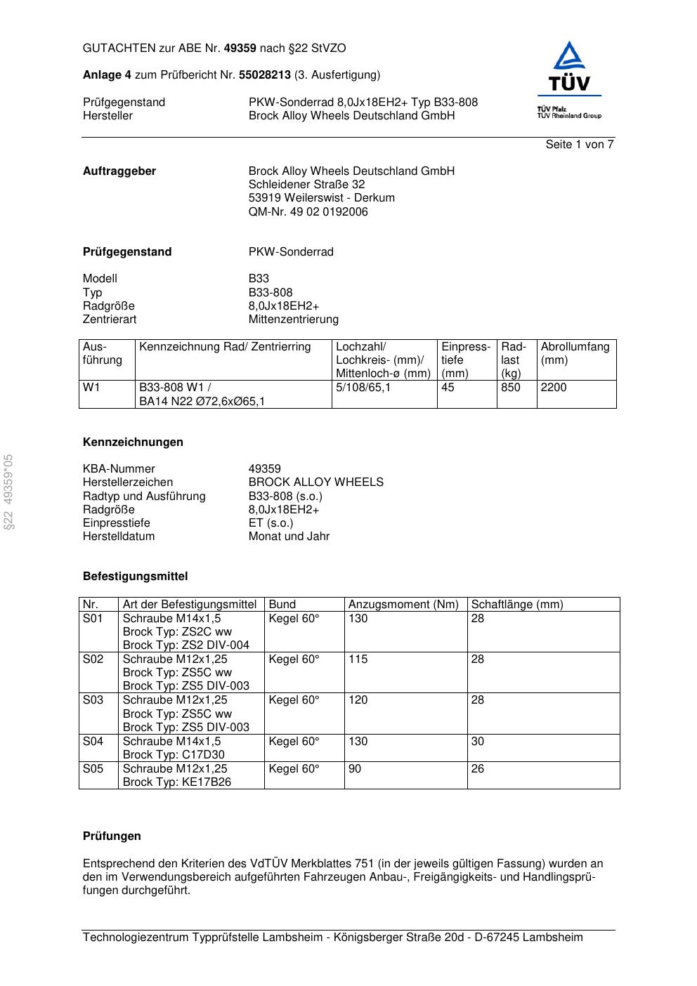 Dieses Gutachten (abe) bezieht sich auf die Alufelge Brock B33-80 8 in der Ausführung ET 0, Mittenloch 0 mm (KBA 49359). Im PDF findest du typischerweise zulässige Reifengrößen, Auflagen/Anbauhinweise und – je nach Dokument – Hinweise zur Eintragung.