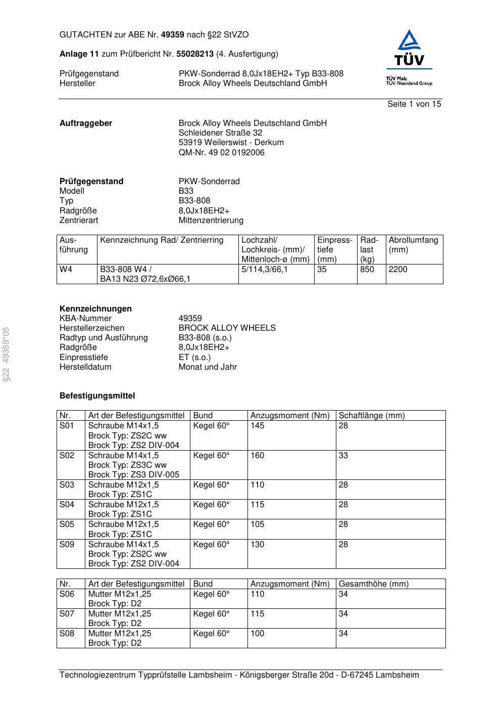 Dieses Gutachten (abe) bezieht sich auf die Alufelge Brock B33-80 8 in der Ausführung ET 0, Mittenloch 0 mm (KBA 49359). Im PDF findest du typischerweise zulässige Reifengrößen, Auflagen/Anbauhinweise und – je nach Dokument – Hinweise zur Eintragung.
