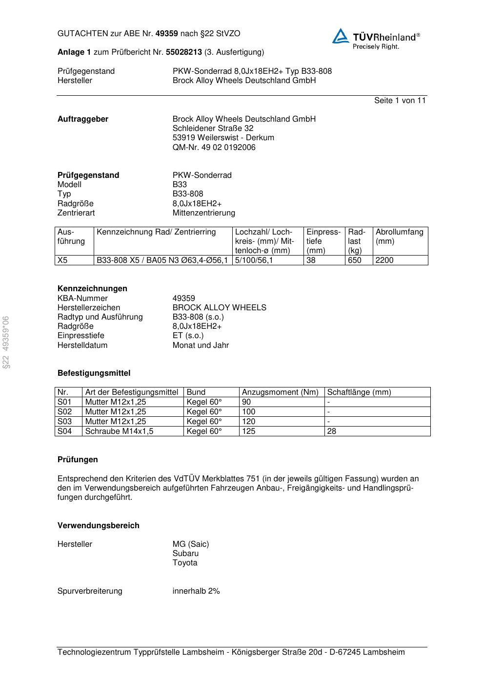 Dieses Gutachten (abe) bezieht sich auf die Alufelge Brock B33-80 8 in der Ausführung ET 0, Mittenloch 0 mm (KBA 49359). Im PDF findest du typischerweise zulässige Reifengrößen, Auflagen/Anbauhinweise und – je nach Dokument – Hinweise zur Eintragung.