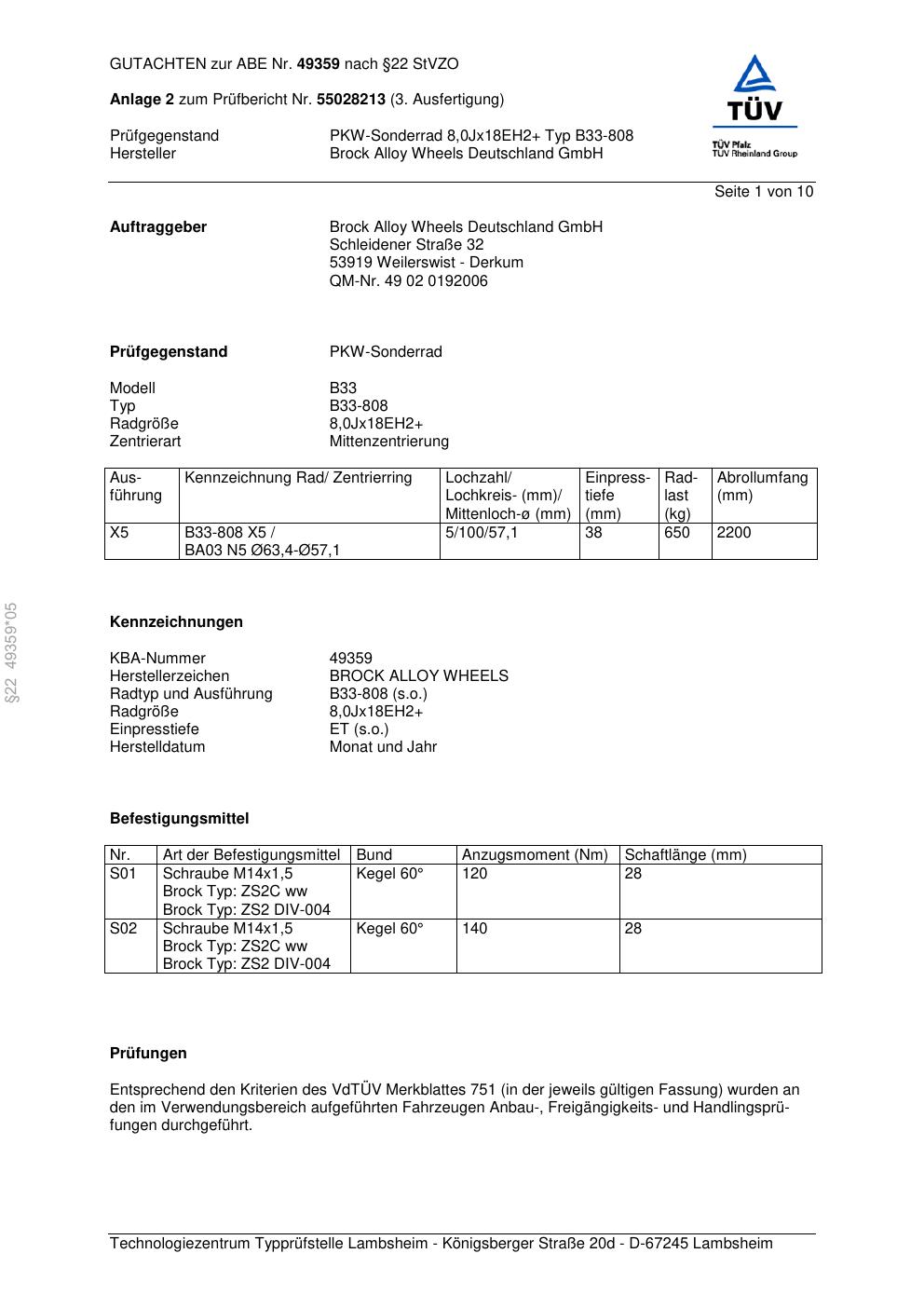 Dieses Gutachten (abe) bezieht sich auf die Alufelge Brock B33-80 8 in der Ausführung ET 0, Mittenloch 0 mm (KBA 49359). Im PDF findest du typischerweise zulässige Reifengrößen, Auflagen/Anbauhinweise und – je nach Dokument – Hinweise zur Eintragung.