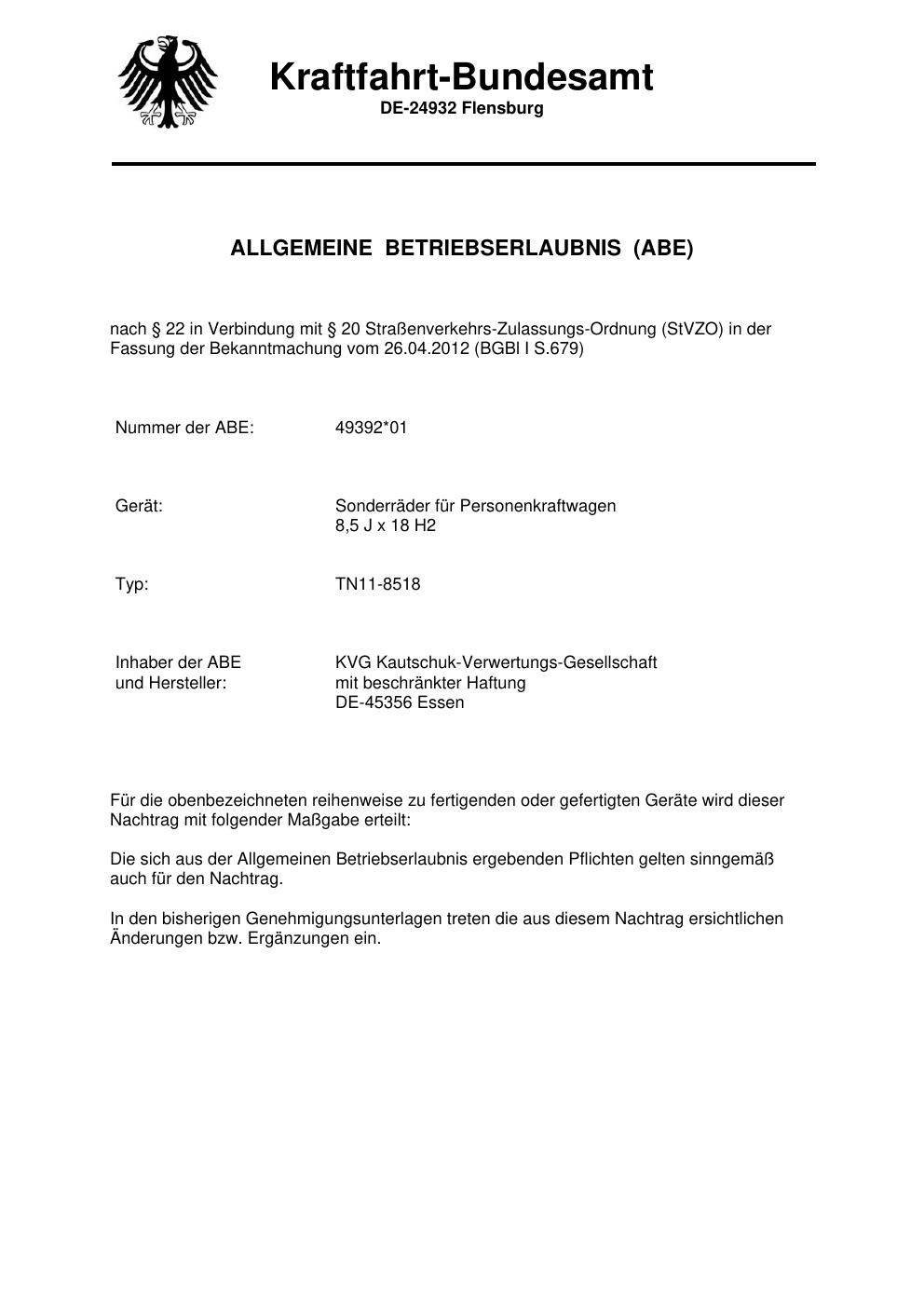 Dieses Gutachten (abe) bezieht sich auf die Alufelge ATS TN11-8518 in der Ausführung 8.5Jx18 ET 0, Mittenloch 0 mm (KBA 49392). Im PDF findest du typischerweise zulässige Reifengrößen, Auflagen/Anbauhinweise und – je nach Dokument – Hinweise zur Eintragung.