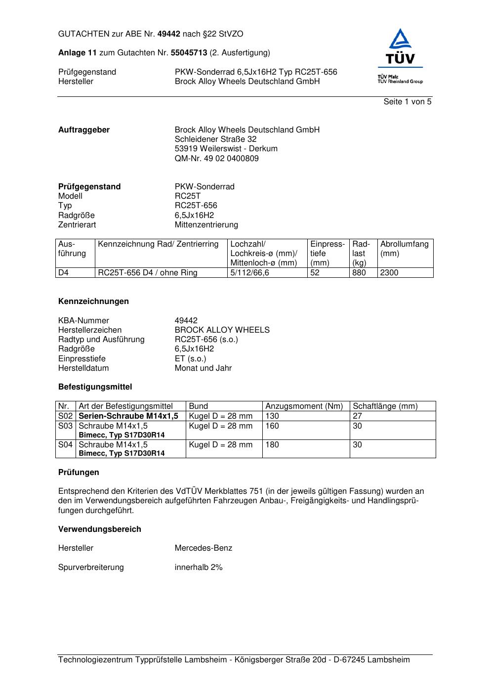 Dieses Gutachten (abe) bezieht sich auf die Alufelge Brock RC25T-65 6 in der Ausführung 6.5Jx16 ET 0, Mittenloch 0 mm (KBA 49442). Im PDF findest du typischerweise zulässige Reifengrößen, Auflagen/Anbauhinweise und – je nach Dokument – Hinweise zur Eintragung.
