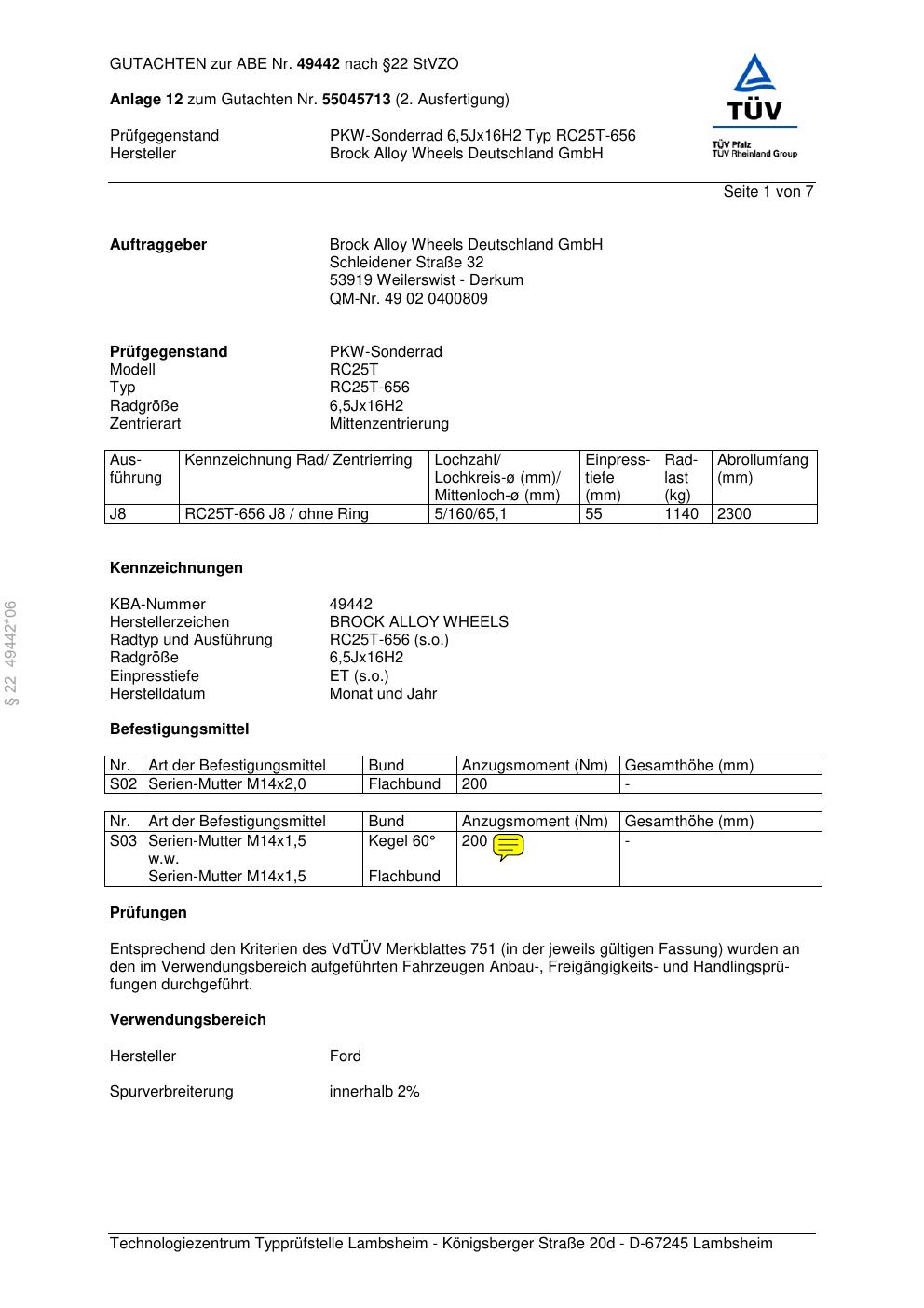 Dieses Gutachten (abe) bezieht sich auf die Alufelge Brock RC25T-65 6 in der Ausführung 6.5Jx16 ET 0, Mittenloch 0 mm (KBA 49442). Im PDF findest du typischerweise zulässige Reifengrößen, Auflagen/Anbauhinweise und – je nach Dokument – Hinweise zur Eintragung.