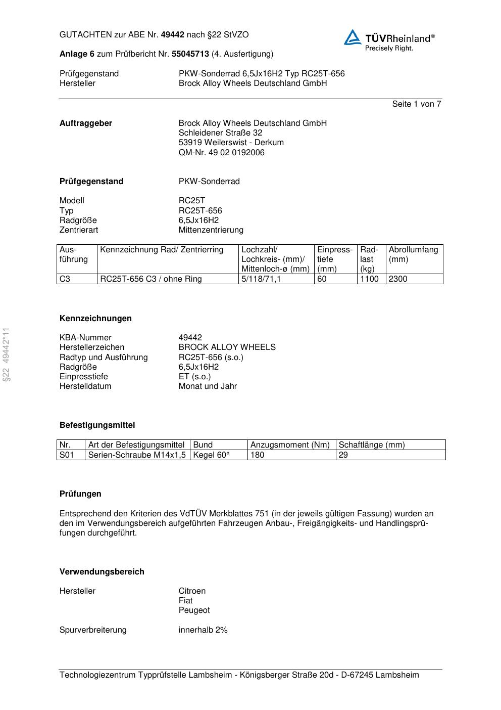 Dieses Gutachten (abe) bezieht sich auf die Alufelge Brock RC25T-65 6 in der Ausführung 6.5Jx16 ET 0, Mittenloch 0 mm (KBA 49442). Im PDF findest du typischerweise zulässige Reifengrößen, Auflagen/Anbauhinweise und – je nach Dokument – Hinweise zur Eintragung.