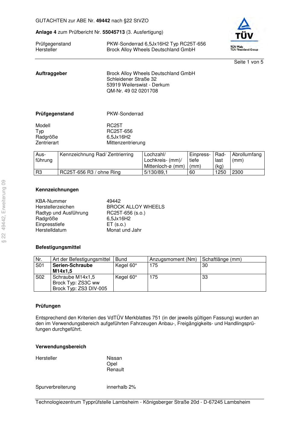 Dieses Gutachten (abe) bezieht sich auf die Alufelge Brock RC25T-656 in der Ausführung 6.5Jx16 ET 0, Mittenloch 0 mm (KBA 49442). Im PDF findest du typischerweise zulässige Reifengrößen, Auflagen/Anbauhinweise und – je nach Dokument – Hinweise zur Eintragung.