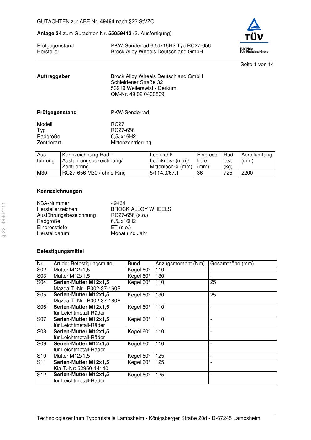 Dieses Gutachten (abe) bezieht sich auf die Alufelge Brock RC27-656 in der Ausführung 6.5Jx16 ET 0, Mittenloch 0 mm (KBA 49464). Im PDF findest du typischerweise zulässige Reifengrößen, Auflagen/Anbauhinweise und – je nach Dokument – Hinweise zur Eintragung.