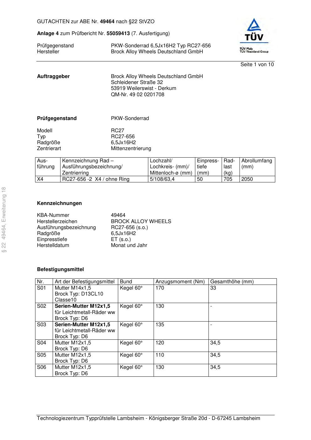 Dieses Gutachten (abe) bezieht sich auf die Alufelge Brock RC27-656 in der Ausführung 6.5Jx16 ET 0, Mittenloch 0 mm (KBA 49464). Im PDF findest du typischerweise zulässige Reifengrößen, Auflagen/Anbauhinweise und – je nach Dokument – Hinweise zur Eintragung.
