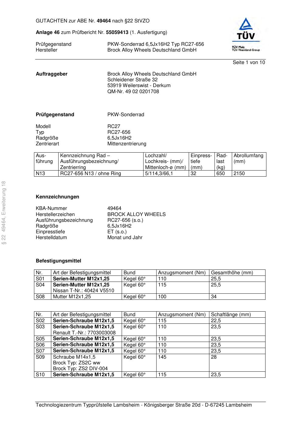 Dieses Gutachten (abe) bezieht sich auf die Alufelge Brock RC27-656 in der Ausführung 6.5Jx16 ET 0, Mittenloch 0 mm (KBA 49464). Im PDF findest du typischerweise zulässige Reifengrößen, Auflagen/Anbauhinweise und – je nach Dokument – Hinweise zur Eintragung.