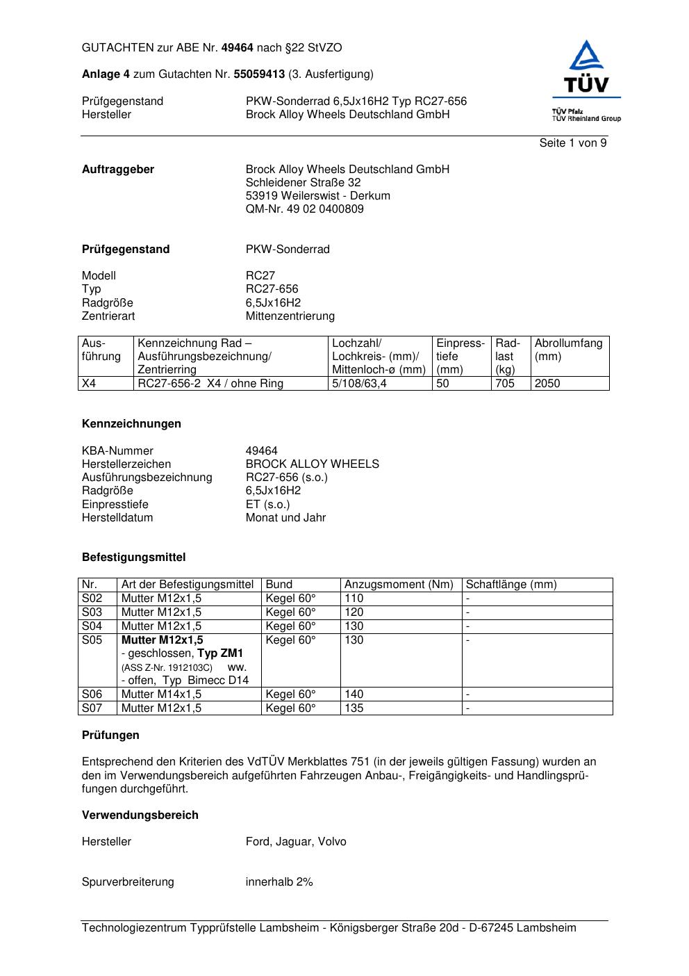 Dieses Gutachten (abe) bezieht sich auf die Alufelge Brock RC27-656 in der Ausführung 6.5Jx16 ET 0, Mittenloch 0 mm (KBA 49464). Im PDF findest du typischerweise zulässige Reifengrößen, Auflagen/Anbauhinweise und – je nach Dokument – Hinweise zur Eintragung.