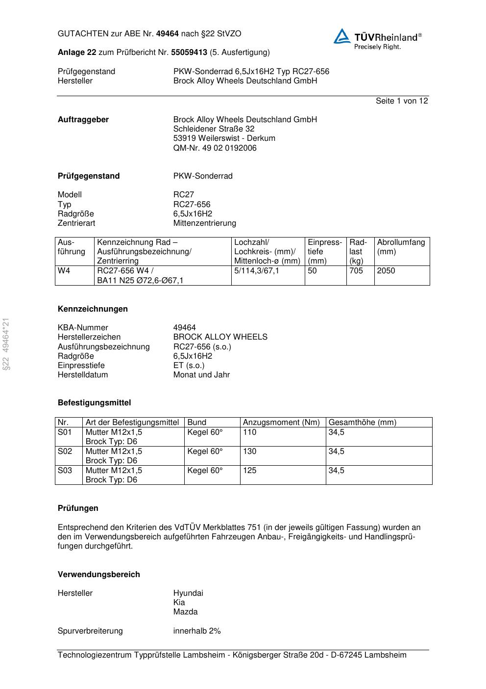 Dieses Gutachten (abe) bezieht sich auf die Alufelge Brock RC27-656 in der Ausführung 6.5Jx16 ET 0, Mittenloch 0 mm (KBA 49464). Im PDF findest du typischerweise zulässige Reifengrößen, Auflagen/Anbauhinweise und – je nach Dokument – Hinweise zur Eintragung.