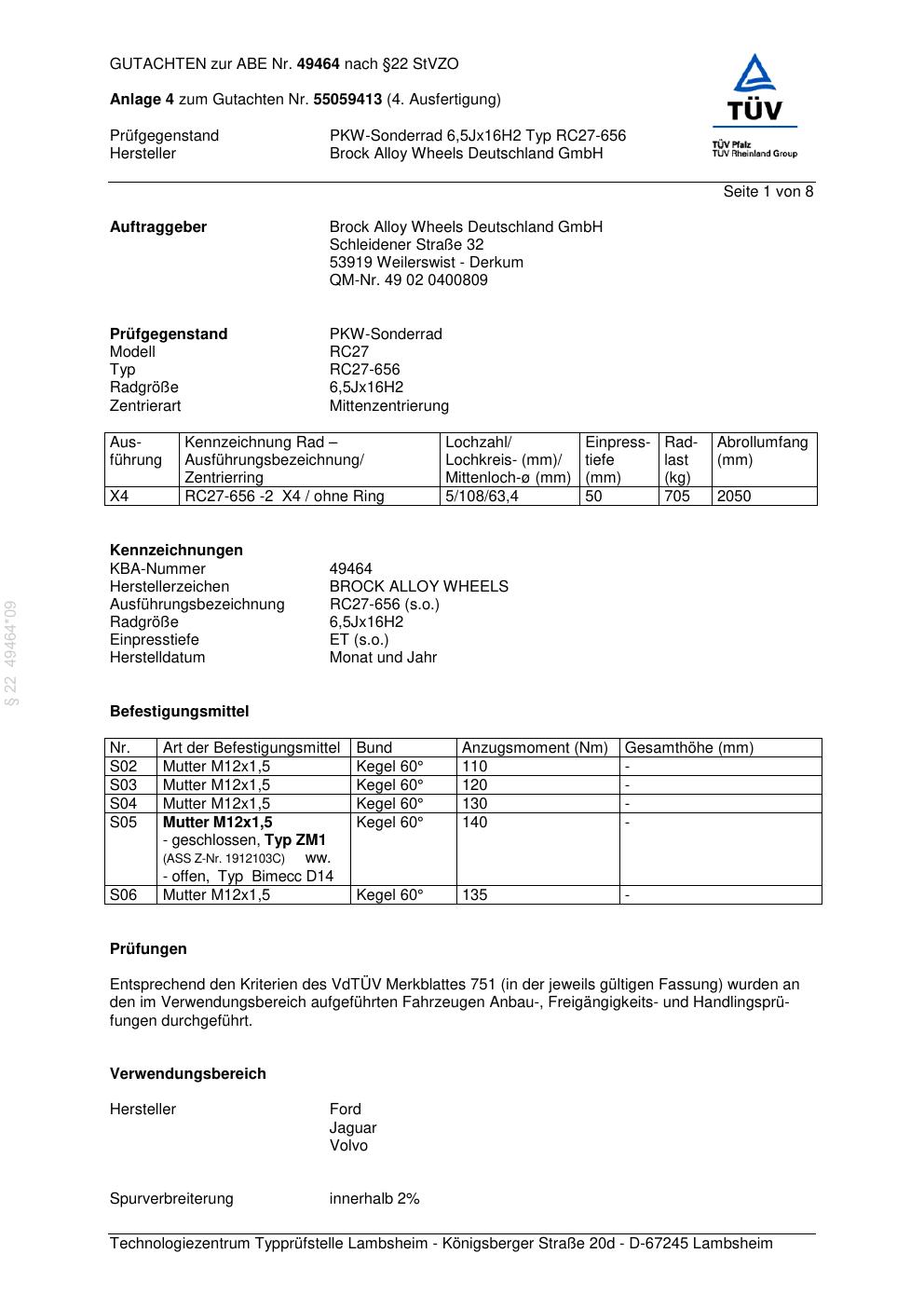 Dieses Gutachten (abe) bezieht sich auf die Alufelge Brock RC27-656 in der Ausführung 6.5Jx16 ET 0, Mittenloch 0 mm (KBA 49464). Im PDF findest du typischerweise zulässige Reifengrößen, Auflagen/Anbauhinweise und – je nach Dokument – Hinweise zur Eintragung.