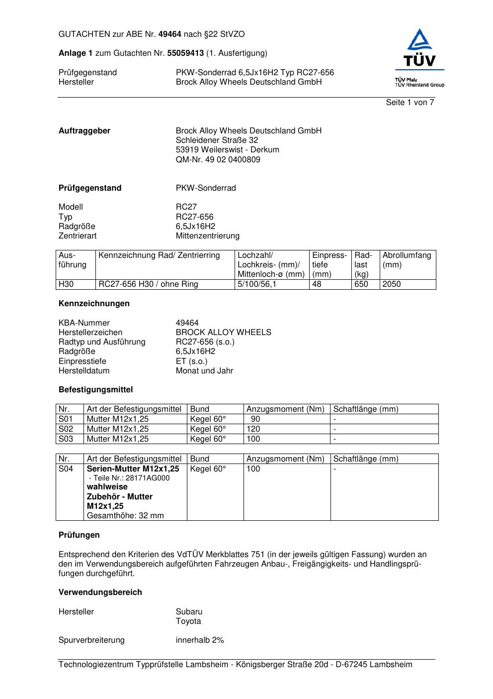 Dieses Gutachten (abe) bezieht sich auf die Alufelge Brock RC27-656 in der Ausführung 6.5Jx16 ET 0, Mittenloch 0 mm (KBA 49464). Im PDF findest du typischerweise zulässige Reifengrößen, Auflagen/Anbauhinweise und – je nach Dokument – Hinweise zur Eintragung.
