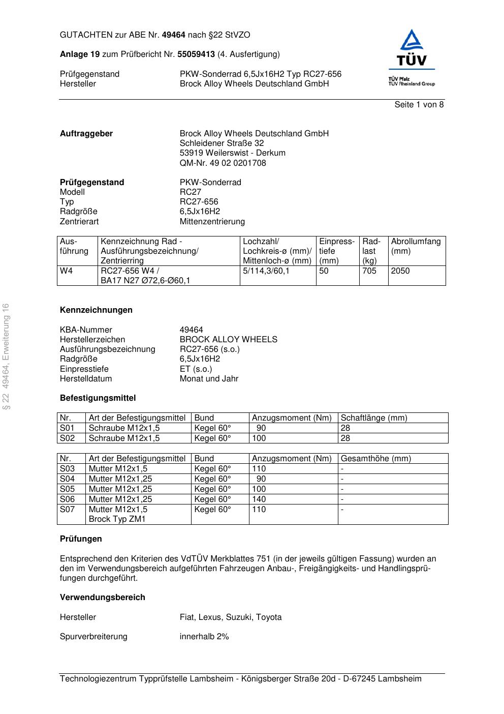 Dieses Gutachten (abe) bezieht sich auf die Alufelge Brock RC27-656 in der Ausführung 6.5Jx16 ET 0, Mittenloch 0 mm (KBA 49464). Im PDF findest du typischerweise zulässige Reifengrößen, Auflagen/Anbauhinweise und – je nach Dokument – Hinweise zur Eintragung.