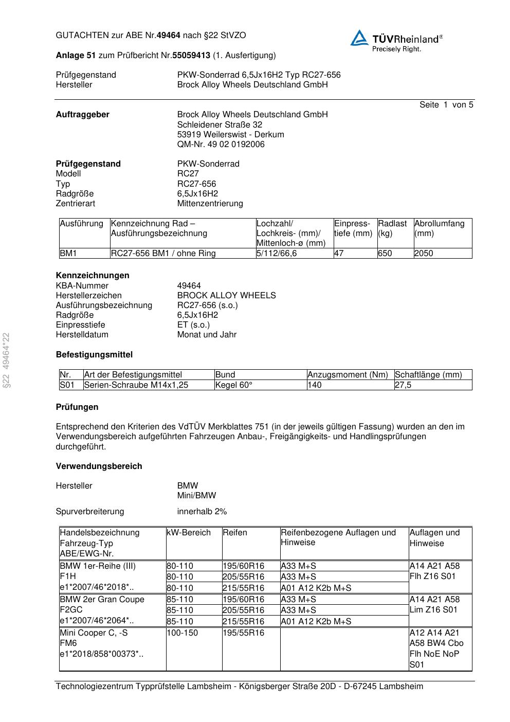 Dieses Gutachten (abe) bezieht sich auf die Alufelge Brock RC27-656 in der Ausführung 6.5Jx16 ET 0, Mittenloch 0 mm (KBA 49464). Im PDF findest du typischerweise zulässige Reifengrößen, Auflagen/Anbauhinweise und – je nach Dokument – Hinweise zur Eintragung.