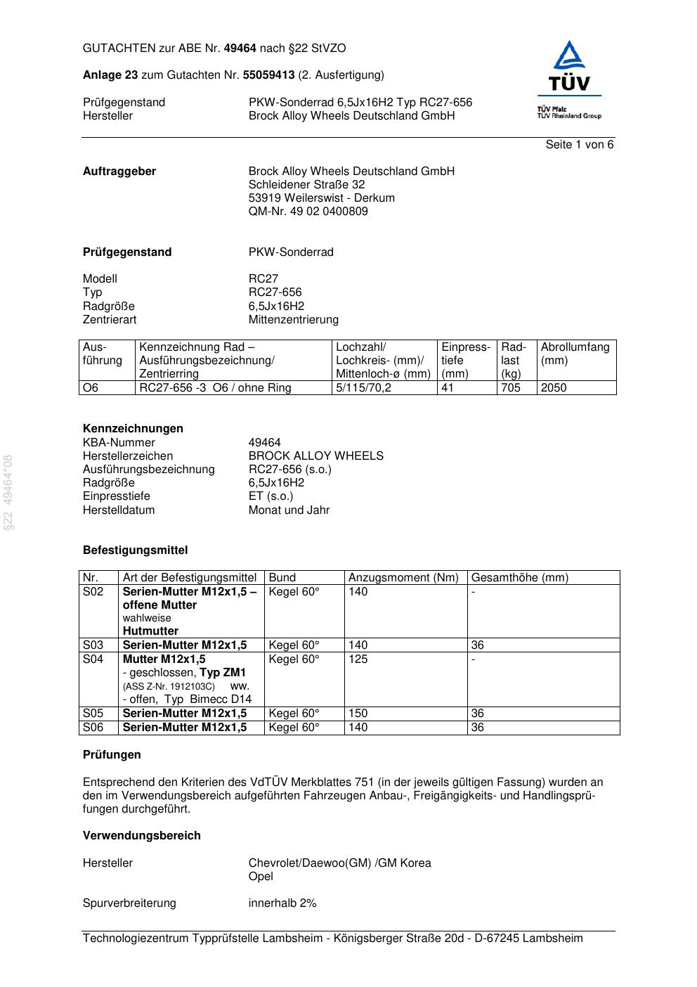 Dieses Gutachten (abe) bezieht sich auf die Alufelge Brock RC27-656 in der Ausführung 6.5Jx16 ET 0, Mittenloch 0 mm (KBA 49464). Im PDF findest du typischerweise zulässige Reifengrößen, Auflagen/Anbauhinweise und – je nach Dokument – Hinweise zur Eintragung.