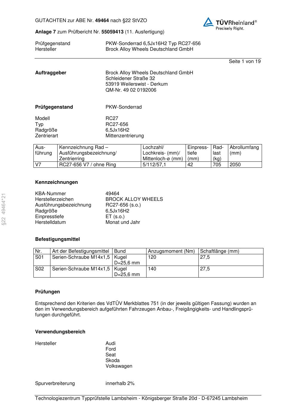 Felgengutachten / abe für Alufelgen Brock RC27-656 (6.5Jx16 ET 0, Mittenloch 0 mm) mit KBA 49464 (Zertifikatsnummer 49464). Hier kostenlos als PDF herunterladen. Der Download-Link ist 24 Stunden gültig und kann bis zu zwei Mal verwendet werden.